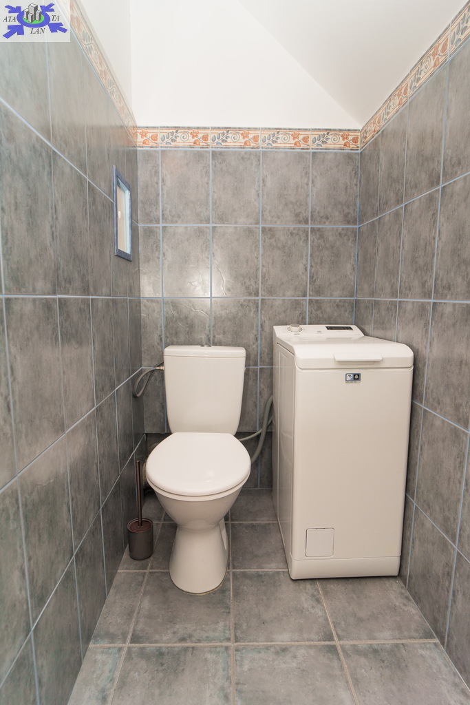 Ściany gładzone i malowane na biały kolor, w łazience podłoga terakota, ściany glazura w naturalnych barwach, okna połaciowe drewniane.