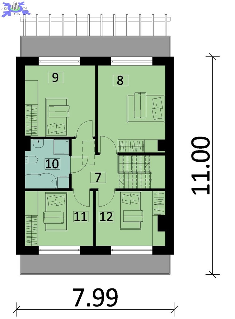 Piętro - cztery pokoje, łazienka z WC oraz korytarz.