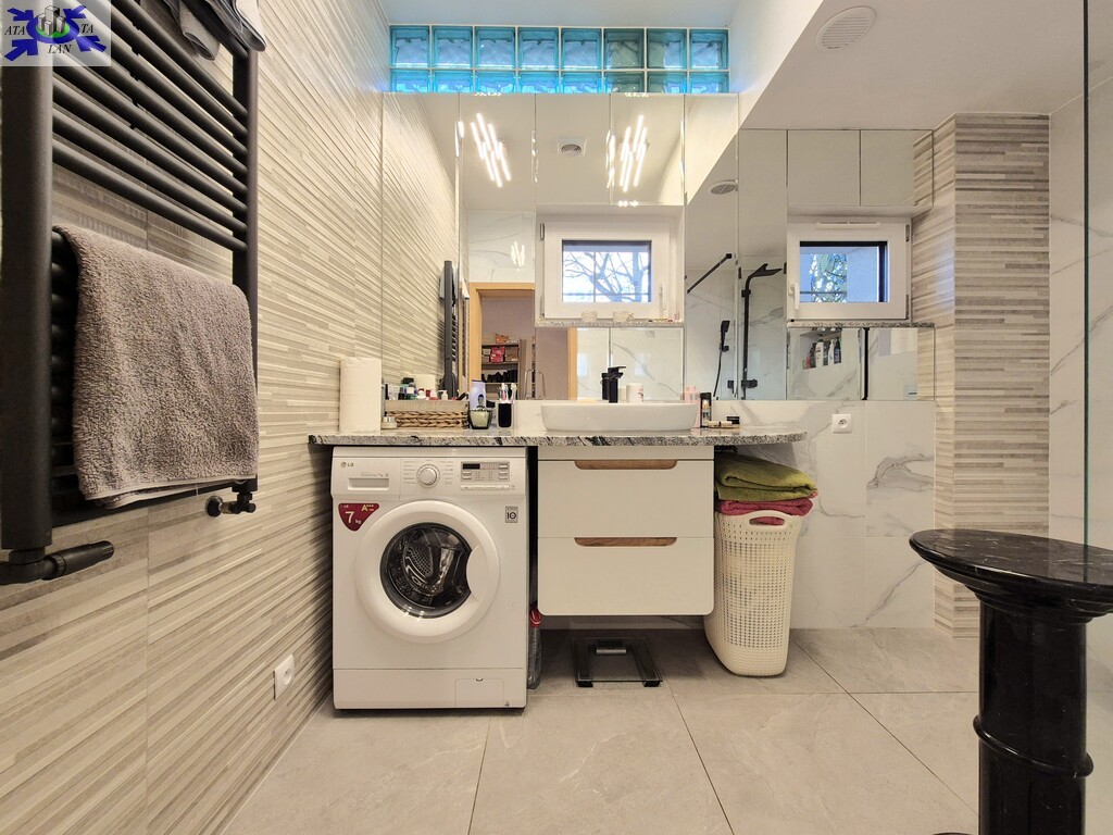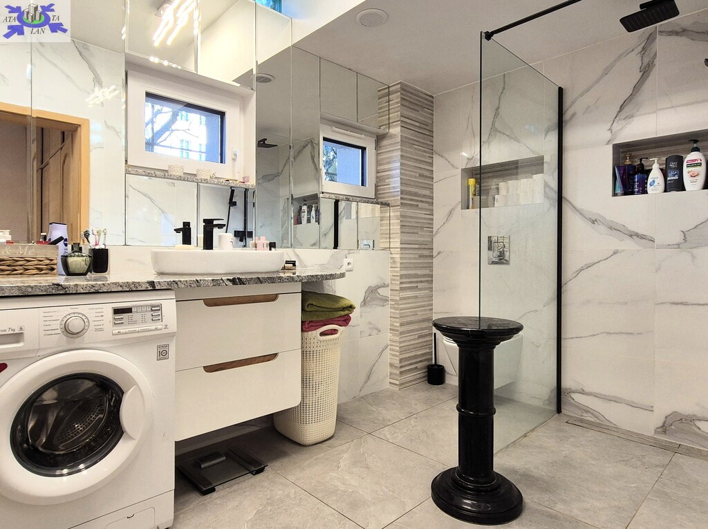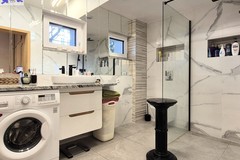 * łazienka wykończona materiałami wysokiej klasy - nowe kafle, nowoczesny grzejnik, WC podtynkowe marki Grohe, kabina typu walk-in, pralka. W łazience zainstalowano dodatkowo wentylację mechaniczną.