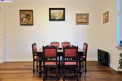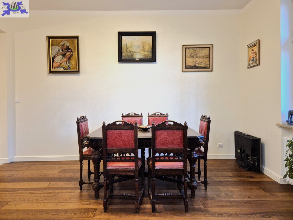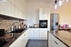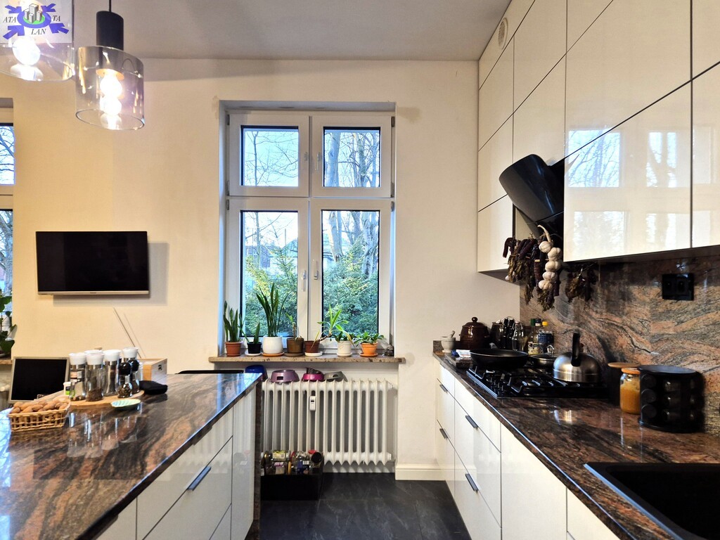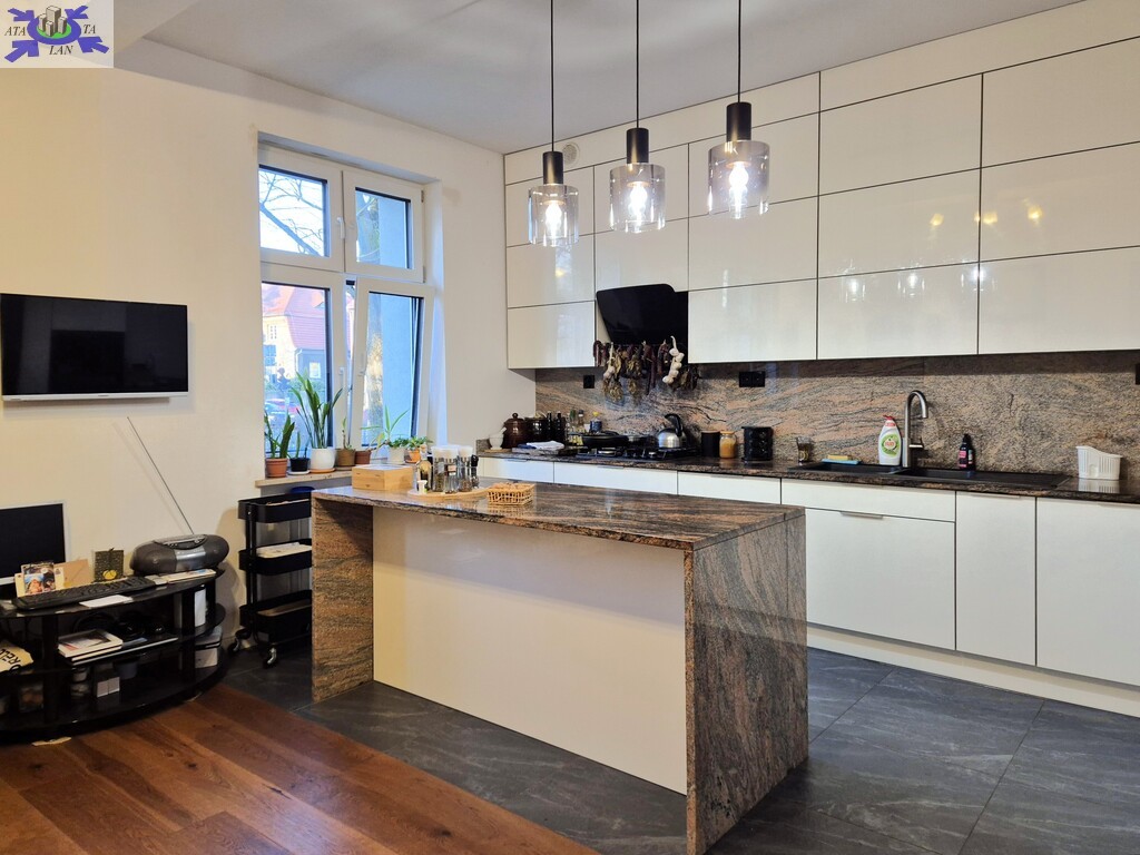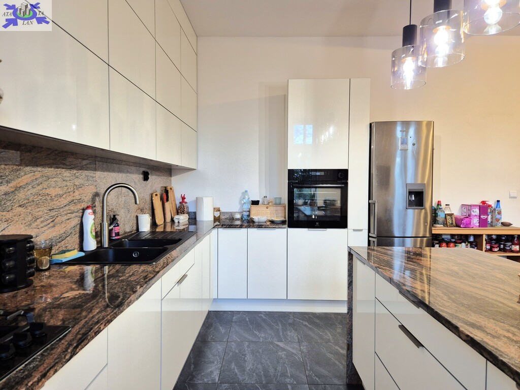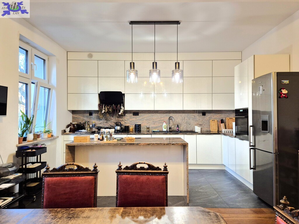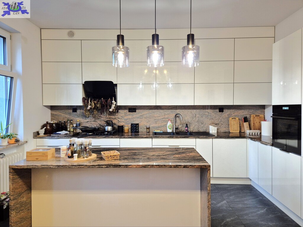 * kuchnia z meblami w zabudowie na wymiar koloru białego z granitowymi blatami i wyspą, wyposażona w sprzęt AGD piekarnik, lodówkę z zamrażarką, płytę gazową, okap z wyciągiem oraz zmywarkę. Kuchnia to przestronne i jasne pomieszczenie połączone z jadalnią, gdzie obecnie znajduje się duży drewniany stół z 6 krzesłami.