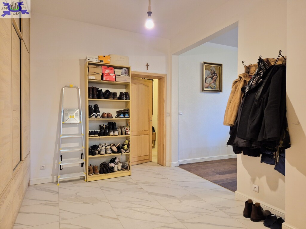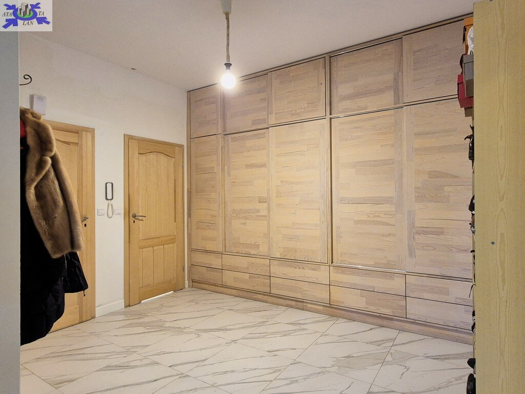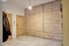 * funkcjonalny przedpokój z dużymi, drewnianymi szafami w zabudowie