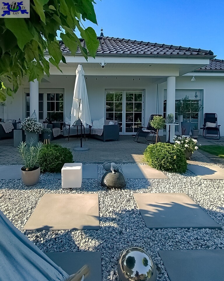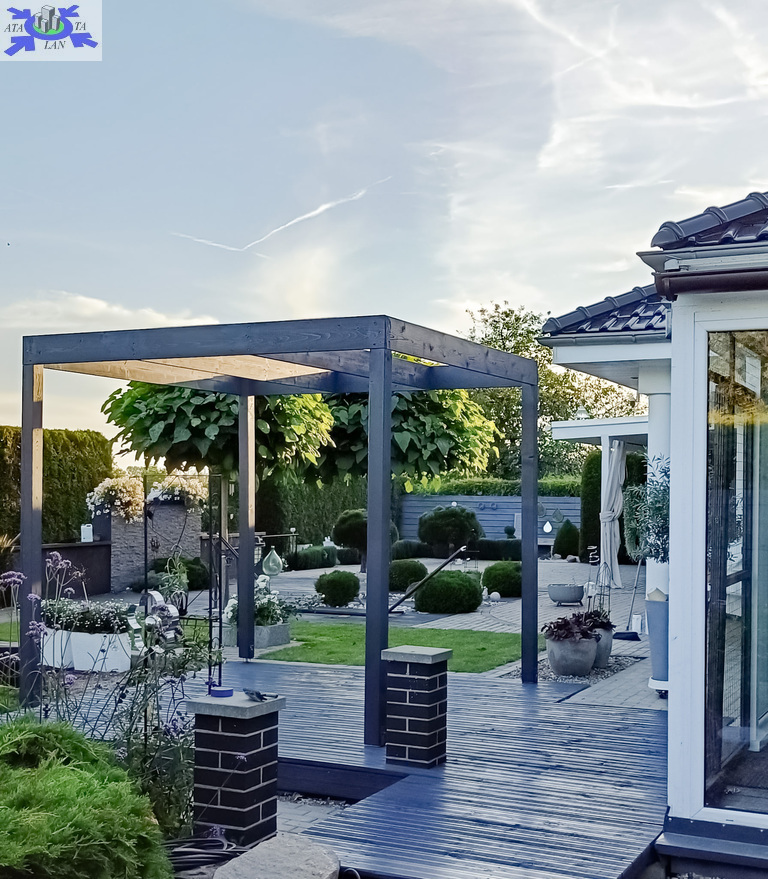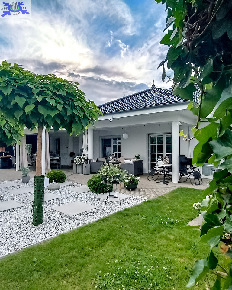Centralnym punktem ogrodu jest duży, zadaszony taras, który w sezonie letnim staje się luksusową strefą wypoczynkową.